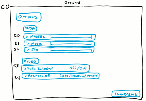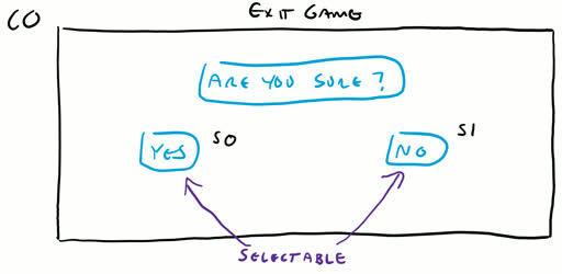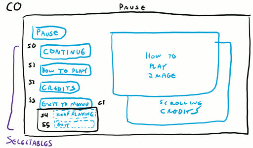 The pause screen is our first example of a relatively complicated UI setup. There is a vertical list of 4 “Selectables” visible when the screen first comes up (S0 - S3). We can navigate up/down between these buttons and select them. The remaining selectables (S4, S5) are hidden until the ‘Exit to Menu’ button is pressed. At this point we can ONLY navigate up/down between these 2 buttons. If we select ‘Keep Playing’ however, we go back to navigating the first 4 buttons, meanwhile S4 & S5 are made hidden again.