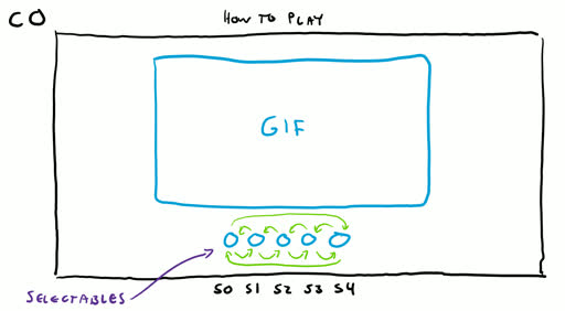 The how to play scene is our first example scene where we have a horizontal list of “Selectables” that we need to navigate through with left/right. In this particular scene ‘Select’ doesn’t do anything, we are simply flipping through pages of how-to-play gifs. The input we are concerned about: