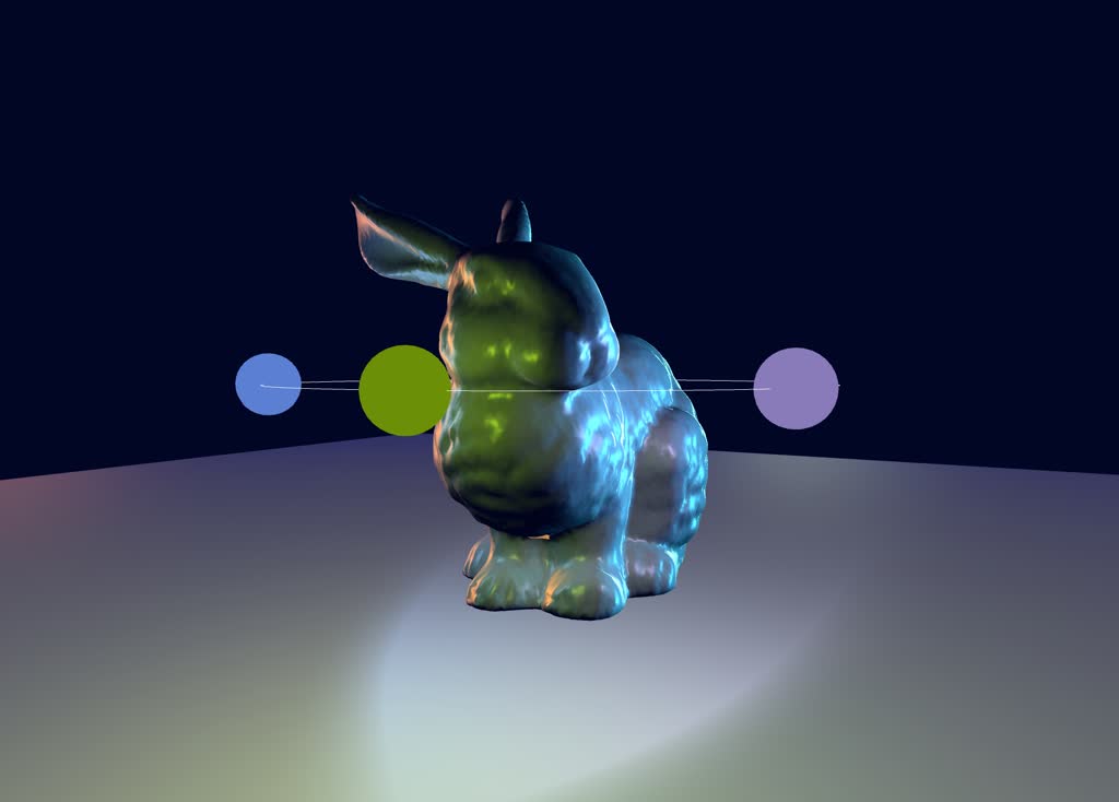 The Stanford Bunny surrounded by orbiting light spheres. The orbs light the scene as a point light, a spot light, or a directional light. The bunny is rendered using the Phong shading model.