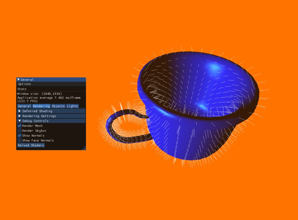 More light-weight debug objects such as the light orbs and vertex normals are rendered after the deferred rendering pass using forward rendering.